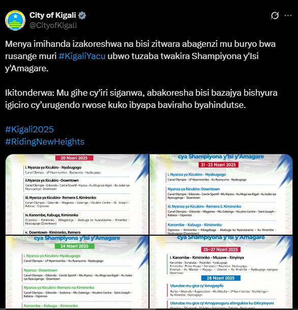 Umujyi wa Kigali watangaje ko mu gihe Shampiyona y’Isi y’Amagare izaba iri kubera mu Rwanda, kuva ku wa 21 kugeza ku wa 28 Nzeri 2025, abagenzi bakoresha bisi rusange bazajya bishyura igiciro cy’urugendo rwose, kubera ko ibyapa bahagararaho byahinduwe.