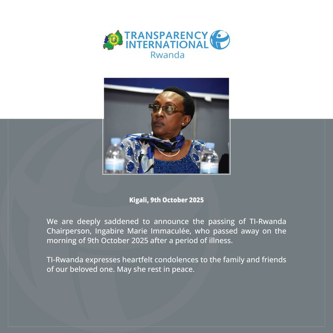 Ingabire Immaculée, Umuyobozi wa Transparency International Rwanda umuryango urwanya ruswa n’akarengane yitabye Imana mu gitondo cyo kuri uyu wa Kane azize uburwayi, afite imyaka 64.