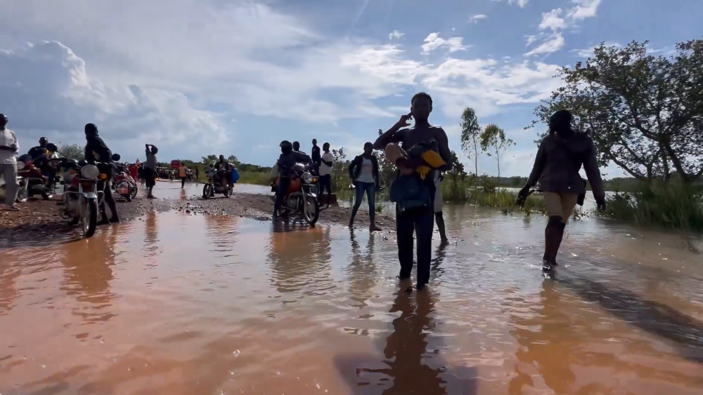 Abanyamuryango b’ishyaka National Unity Platform (NUP), riyoborwa na Bobi Wine, bagaragaye bagerageza kunyura mu mazi yari yarengeye umuhanda, bamwe bakuramo inkweto kugira ngo bashobore gukomeza urugendo.